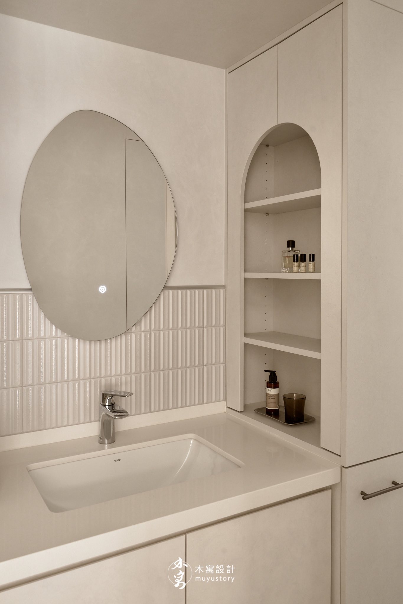 电视墙木作的造型结合了穿鞋椅及收纳的功能,